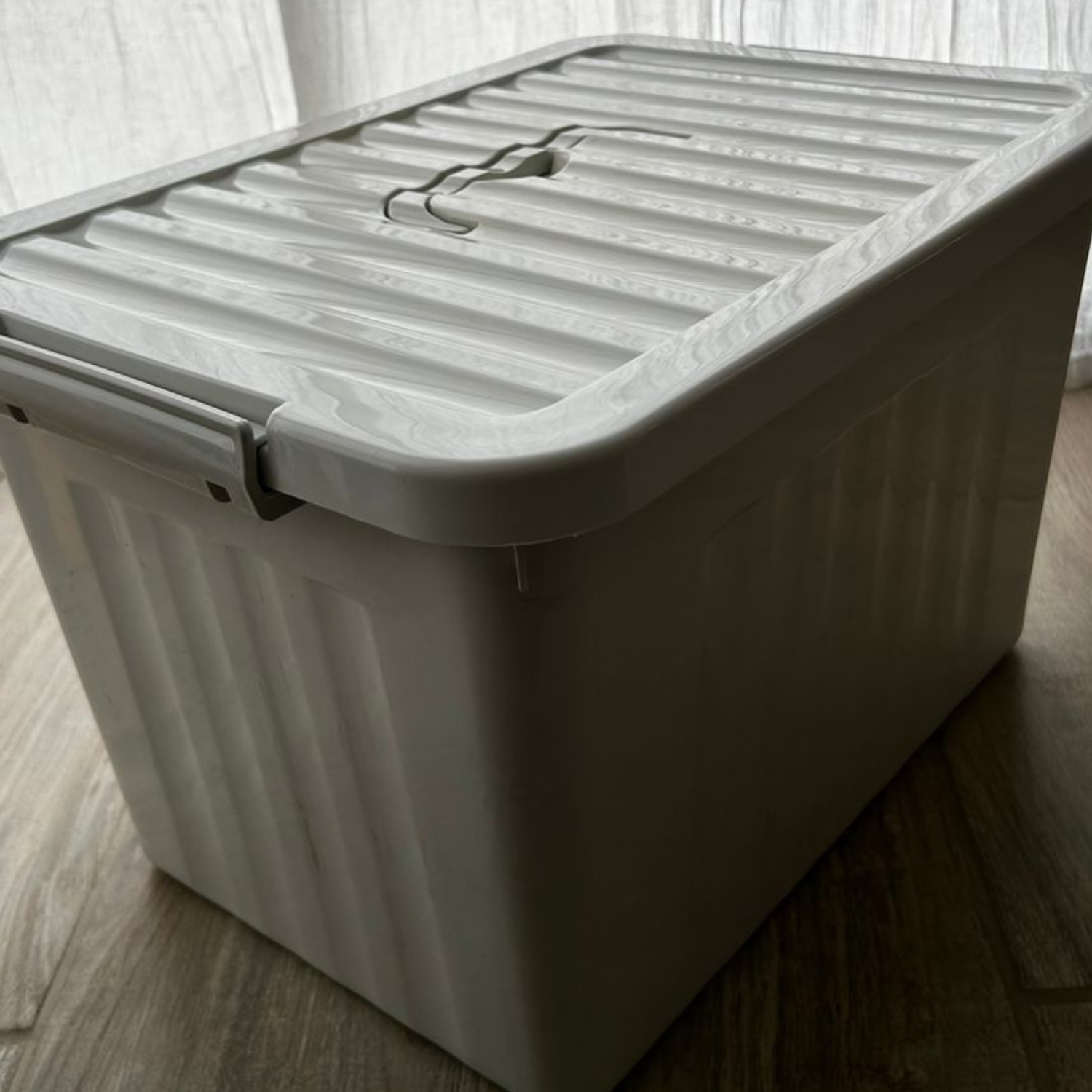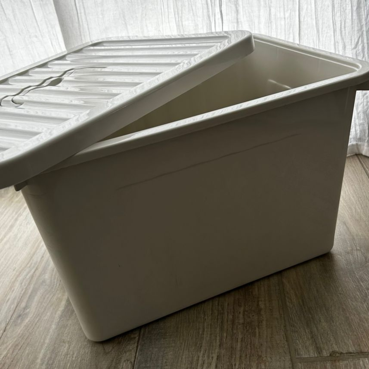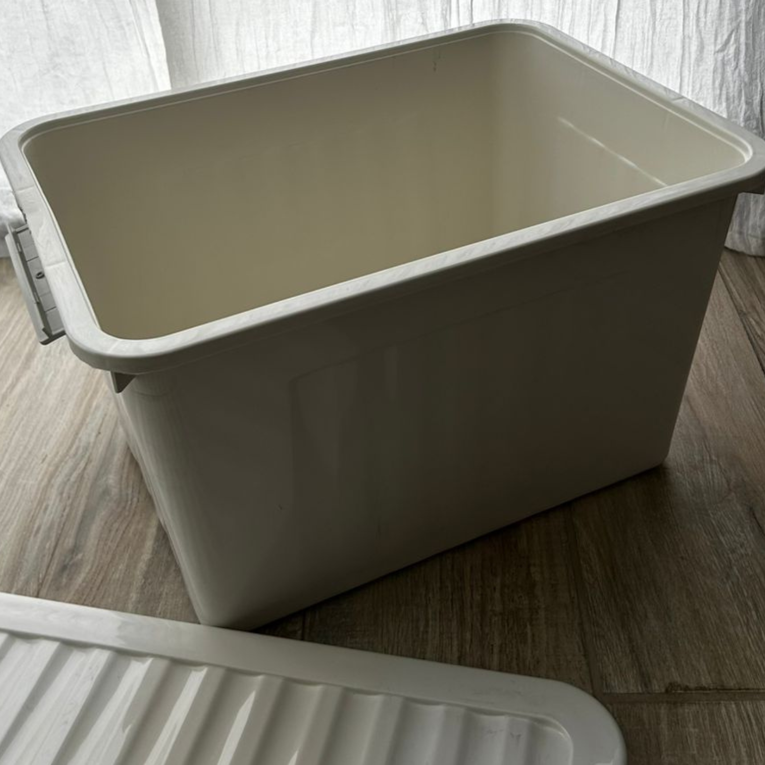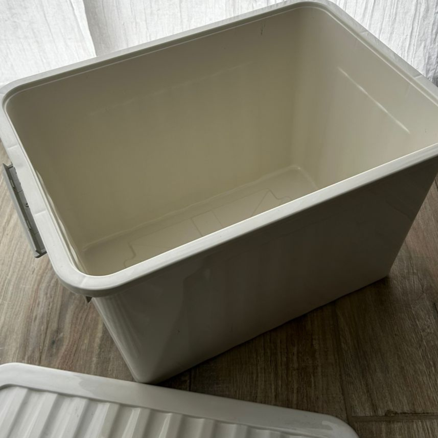Caja organizadora línea eco friendly color beige. Con tapa, manija y trabas.