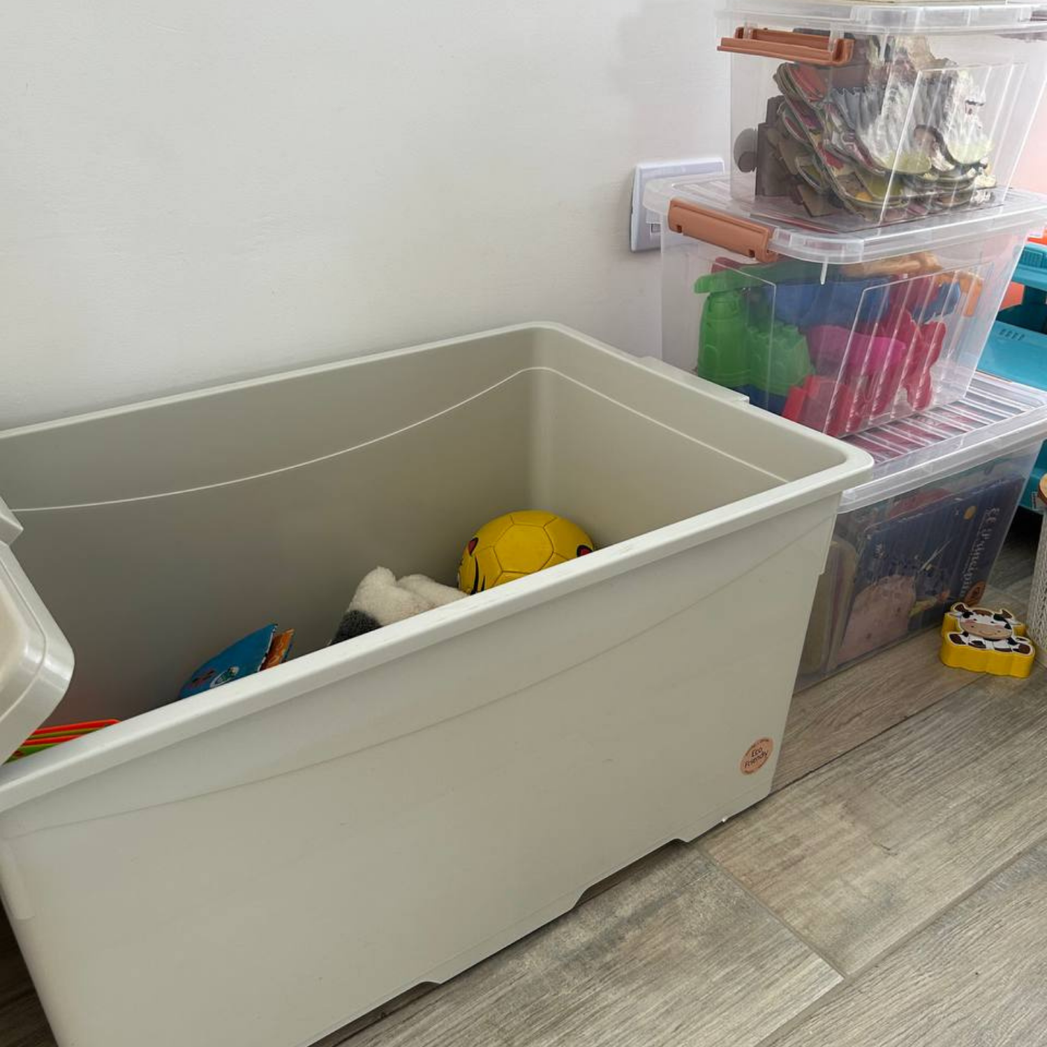 Caja organizadora 55 litros con ruedas. Línea Ecofriendly (color beige). Apilables.