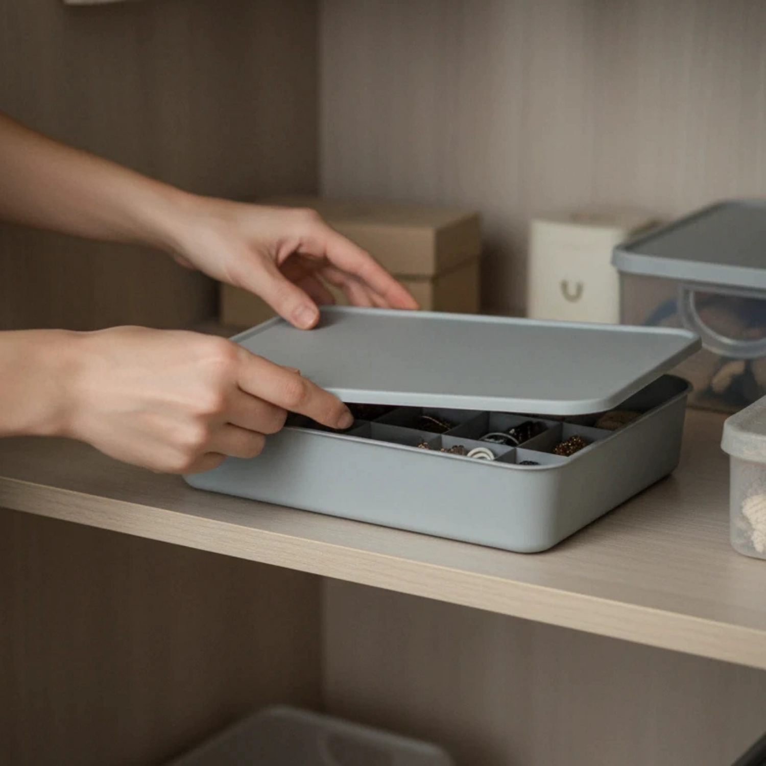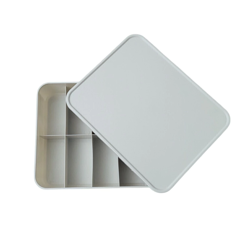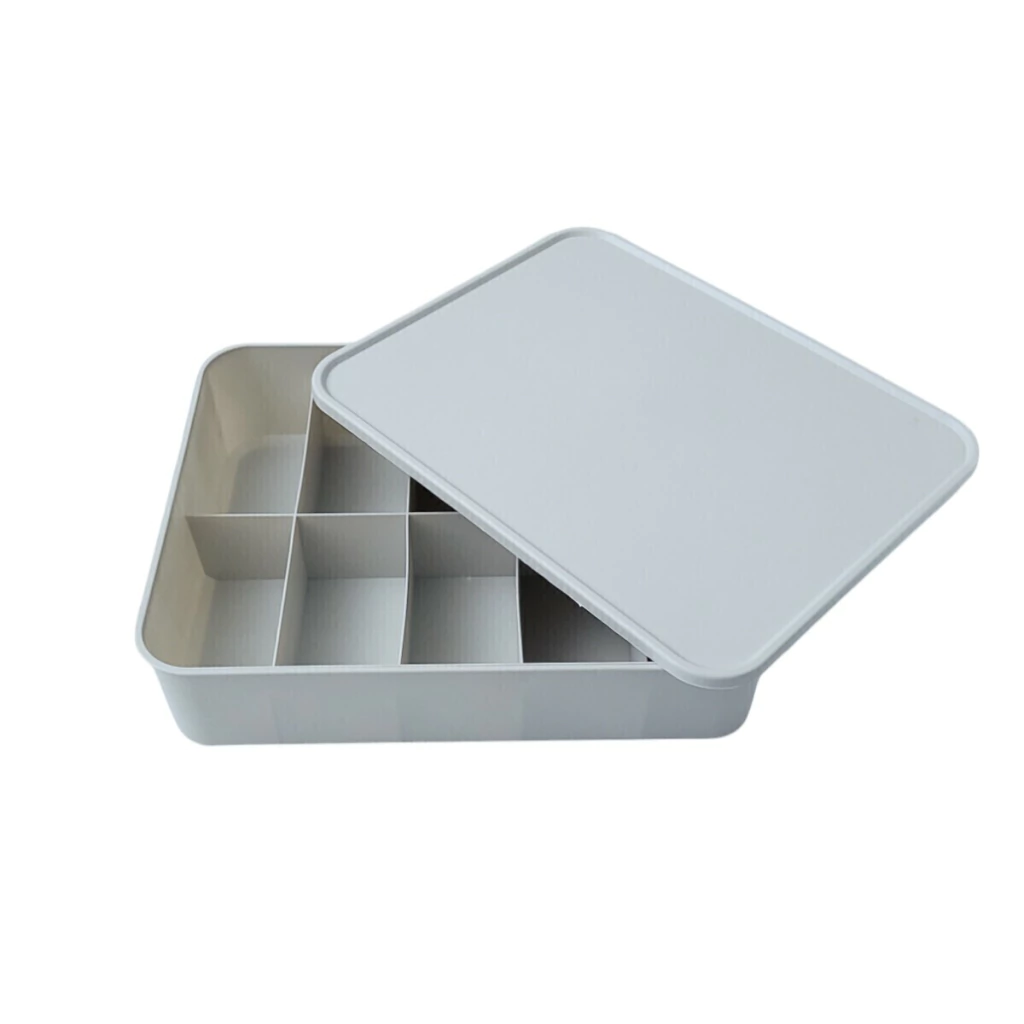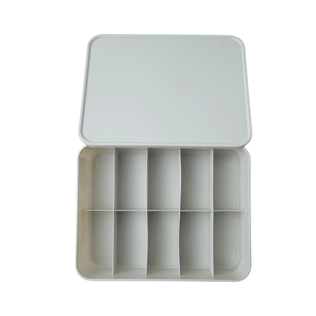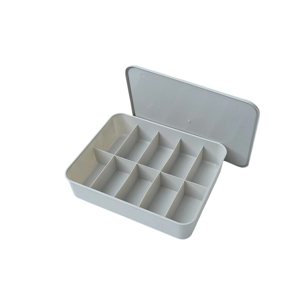 Caja organizadora con 10 divisiones y tapa. Color gris.