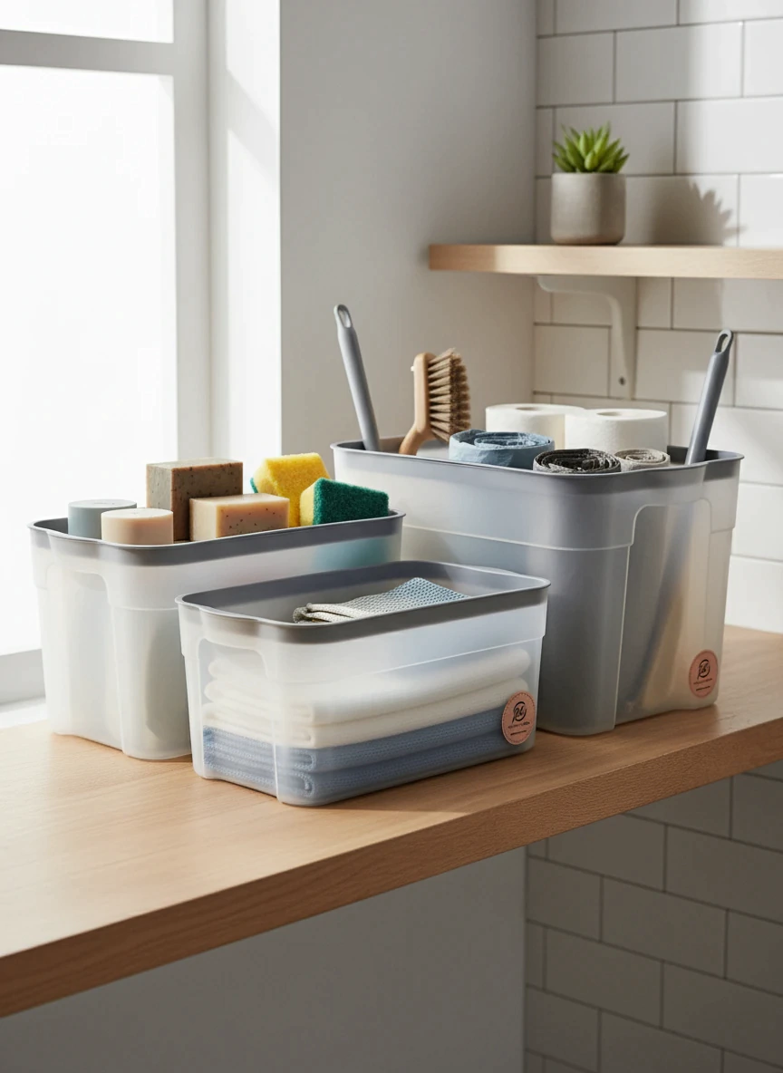 Set de 3 cajas Maxi Box transparentes, tapa color beige.